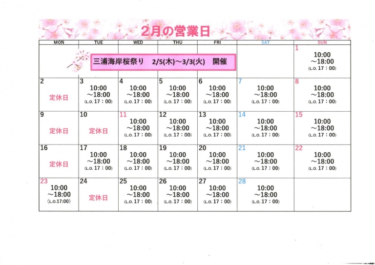 2026年2月の営業日カレンダーです。